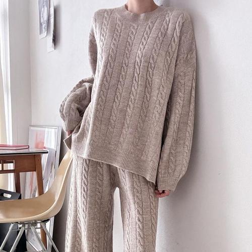 [다잇템]여자 니트투피스 벌룬 꽈배기 니트 통바지 세트 (19369703A)