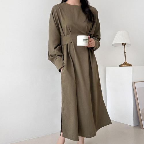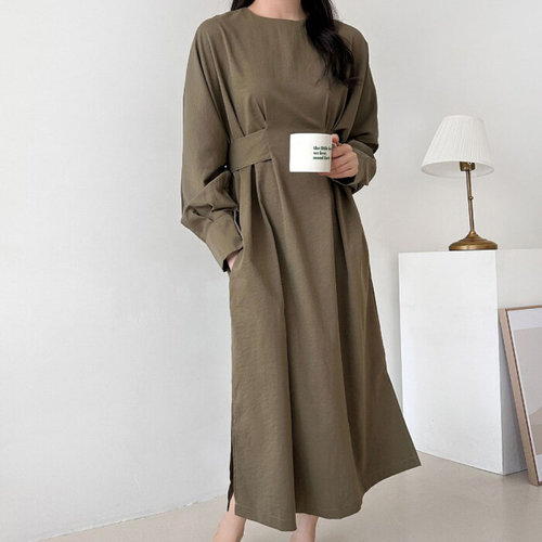 [옷자락] 여성 봄 하객룩 버튼 벨트 퍼프 롱 원피스 빅사이즈 트임