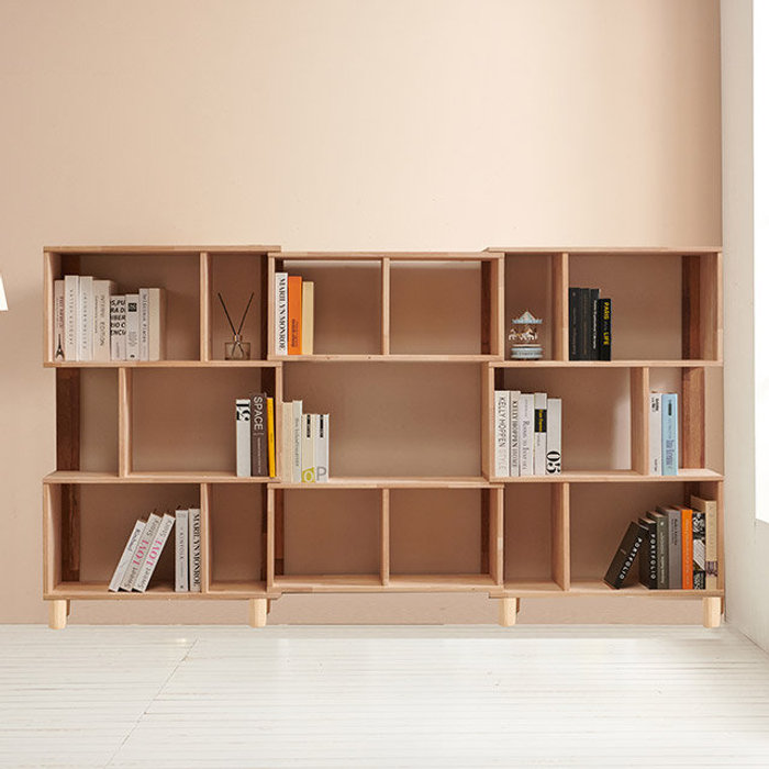 히트가구 [착불배송 상세확인] H6893 고무나무 3단 원목발 와이드 책장 세트 1color