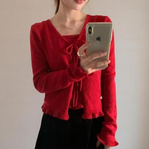 [신상오픈런]여성 러블리 울혼방 리본 브이넥 나시 가디건 세트