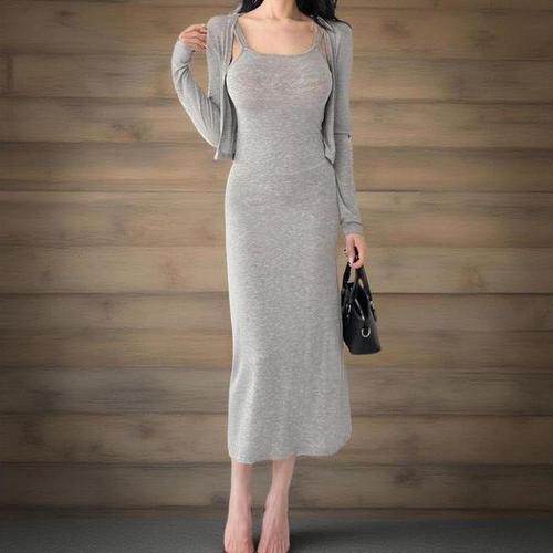 [신상오픈런]여성용 롱 원피스와 크롭 가디건 세트 데일리 나시 스타일