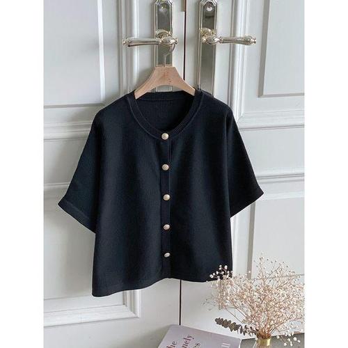 [샵앤]여성 라운드넥 금장 단추 가오리핏 반팔 니트 가디건 DGB-WCD-4738-블랙
