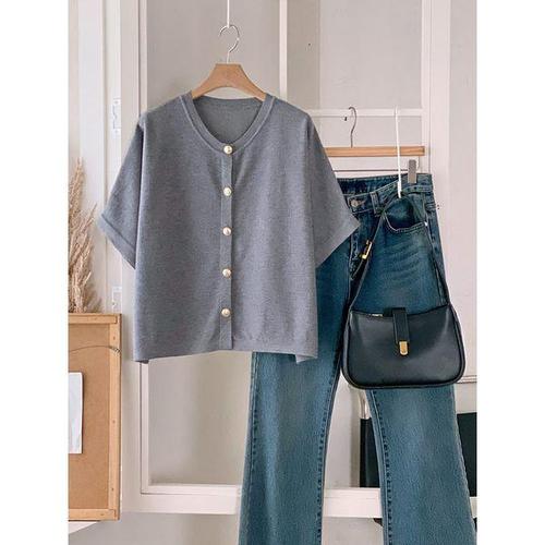 [샵앤]여성 라운드넥 금장 단추 가오리핏 반팔 니트 가디건 DGB-WCD-4738-그레이