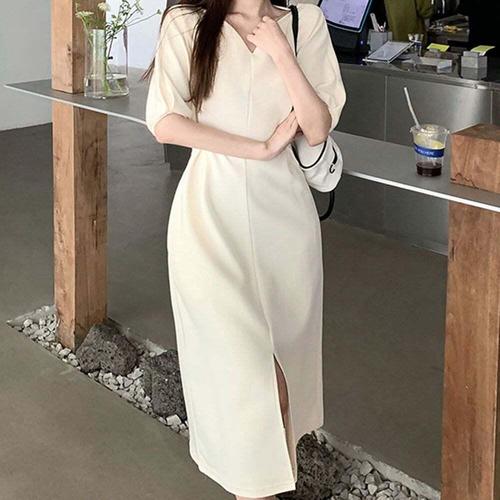 [모노무드]모노무드 브이넥 절개 원피스 체형커버 신축성 가오리소매 심플