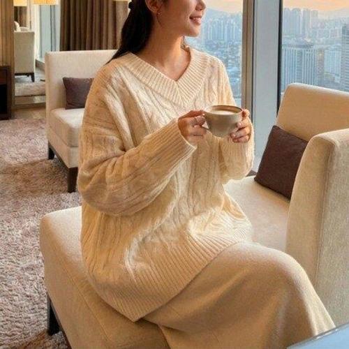 [페리엠][국산] 가오리핏 브이넥 꽈배기 오버핏 로니텔니트티