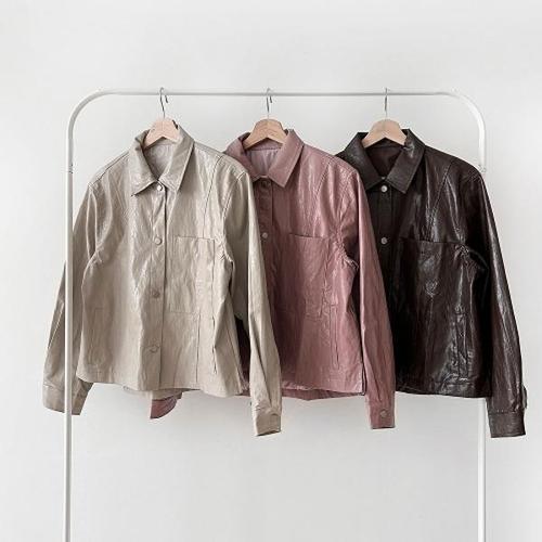 [다잇템]여성 스냅 핑크가죽 카라넥 대형포켓 가을용