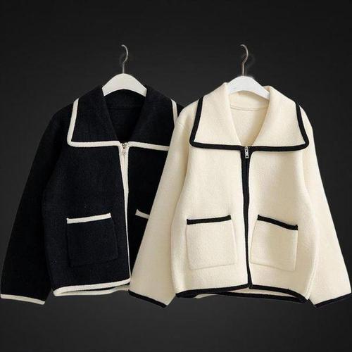 [신상오픈런]여성 배색 큰 카라 가을 하객 패션 포켓 반팔 니트 재킷
