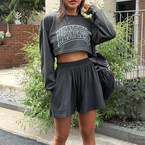[옷자락] 여자 레터링 크롭 긴팔티 밴딩 숏팬츠 가을츄리닝 세트