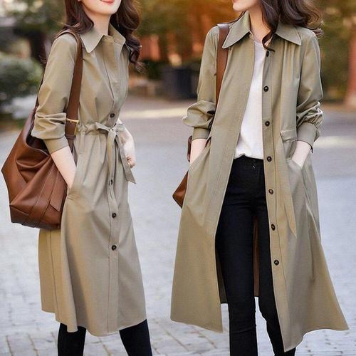 [신상오픈런]여성용 배색 소매 롱 트렌치 코트 벨트 스타일 간절기 외투
