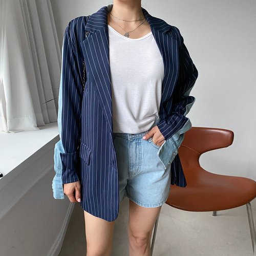 네쥬 여성 가을 데님 스트라이프 배색 캐주얼 긴팔 자켓