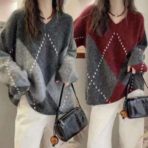 겨울 니트 스웨터 여성 셔츠 여자 긴팔 티 도톰 브이 아가일 루즈핏 WFKZKUF