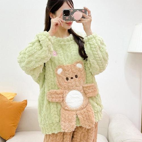 [옷자락] 여자 키치룩 꽈배기 극세사 곰돌이 배색 겨울잠옷 세트