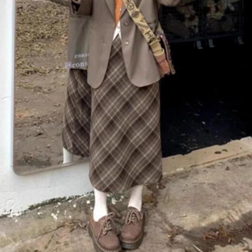 여성 가을 겨울 체크 허리 밴딩 A라인 롱 스커트 치마 WFKZ8RB