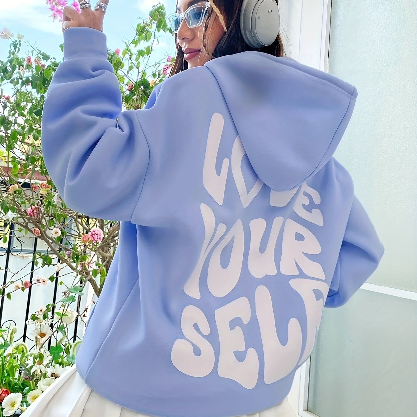 TEMU 셀프러브 슬로건 후드티 - "LOVE YOURSELF" 백 프린트, 오버사이즈 드롭 숄더 보온, 드로스트링 후드 & 한국풍 레터링 - 겨울용 따뜻한 캐주얼 스웨트셔츠 (세탁기 사용 가능)
