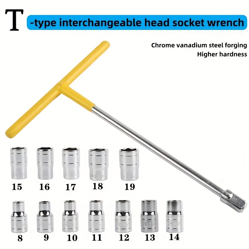 TEMU 13피스 T자 렌치 세트 - 주철 크롬 바나듐강, 12개 소켓 포함 (8-19mm), 확장형 연결 막대, 고무 그립, 교체 가능한 헤드 - 다용도 세트 - 자동차, 트럭 및 오토바이에 적합 - 차량 내 장치 도구, 토크렌치, 토크증폭기, 토크 렌치
