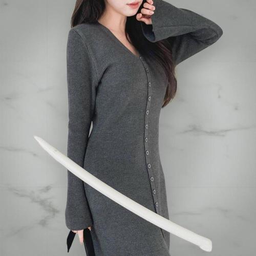 [다잇템]여성 롱 드레스 단추 골지슬림 V넥 앞트임