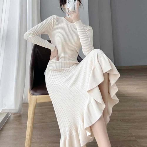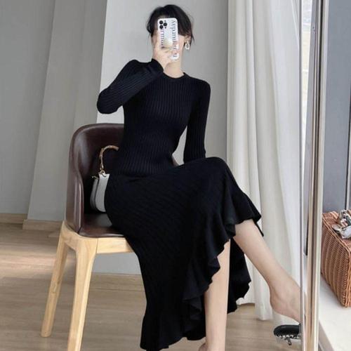 여성 골지 니트 롱원피스 1P 프릴 하단 치마 러블리여자긴팔 간절기미니 출근용 데이트룩 하객 가을 봄가을
