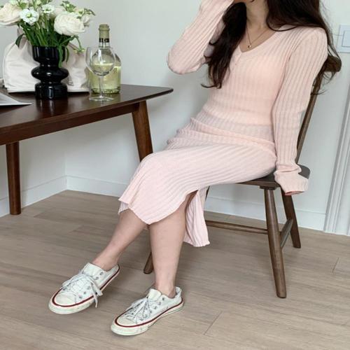 [옷자락] [시즌오프]봄 핑크 골지 브이넥 슬림핏 롱 트임 원피스_5