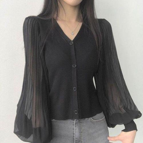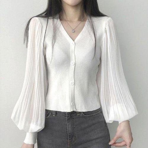 [셀러허브_여성트랜드패션]ONM 브이넥 퍼프 플리츠 블라우스 골지 가디건