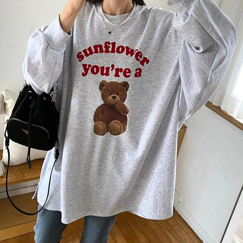 FONOW 남녀공용 오버핏 심플 삐친 곰 프린팅 맨투맨 긴팔 티셔츠