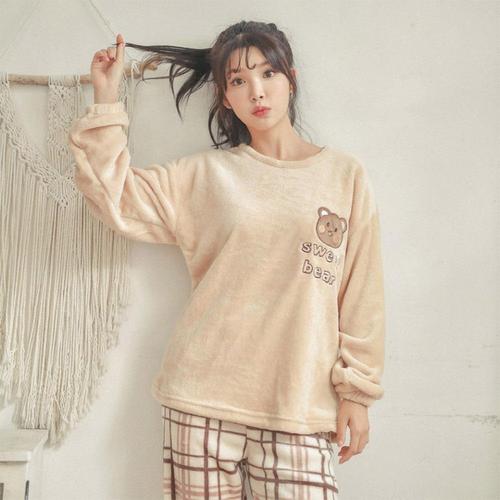 [옷자락] 여자 러블리 겨울 곰 극세사 오버핏티 체크바지 잠옷
