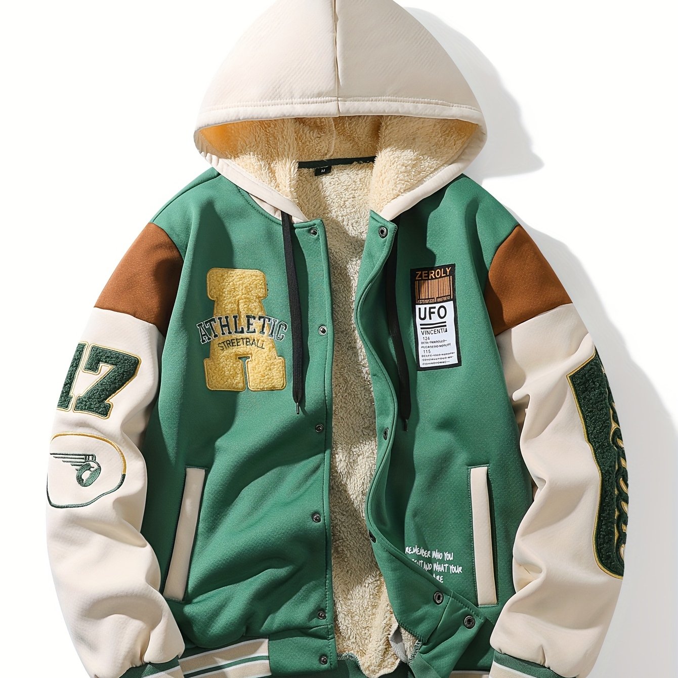 TEMU 남성용 캐주얼 후드 야구 점퍼, 자수 레터링, 컬러 블록 디자인, 스냅 단추 여밈, 긴소매, 포켓 - 그린 & 화이트, 레귤러 핏, 아웃도어 스포츠 & 캐주얼 복장, 캐주얼 아웃도어 웨어 | 컬러 블록 재킷 | 튼튼한 원단