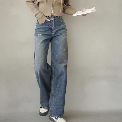 [신상오픈런]여자 스크래치 구제 논스판 빅사이즈 통 일자 청바지