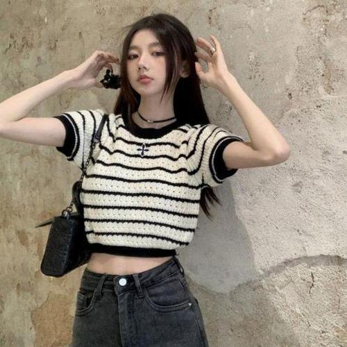 [다잇템][다잇템] 여자 탱크 꽃잎 브로치 SS 귀여운 반소매 줄무늬 니트_16581555_588872