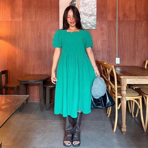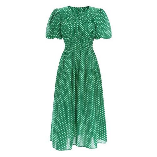 [샵앤] 스모크밴딩 라운드 퍼프소매 데일리 여성 반팔 롱원피스 RC-WDR-11994-그린