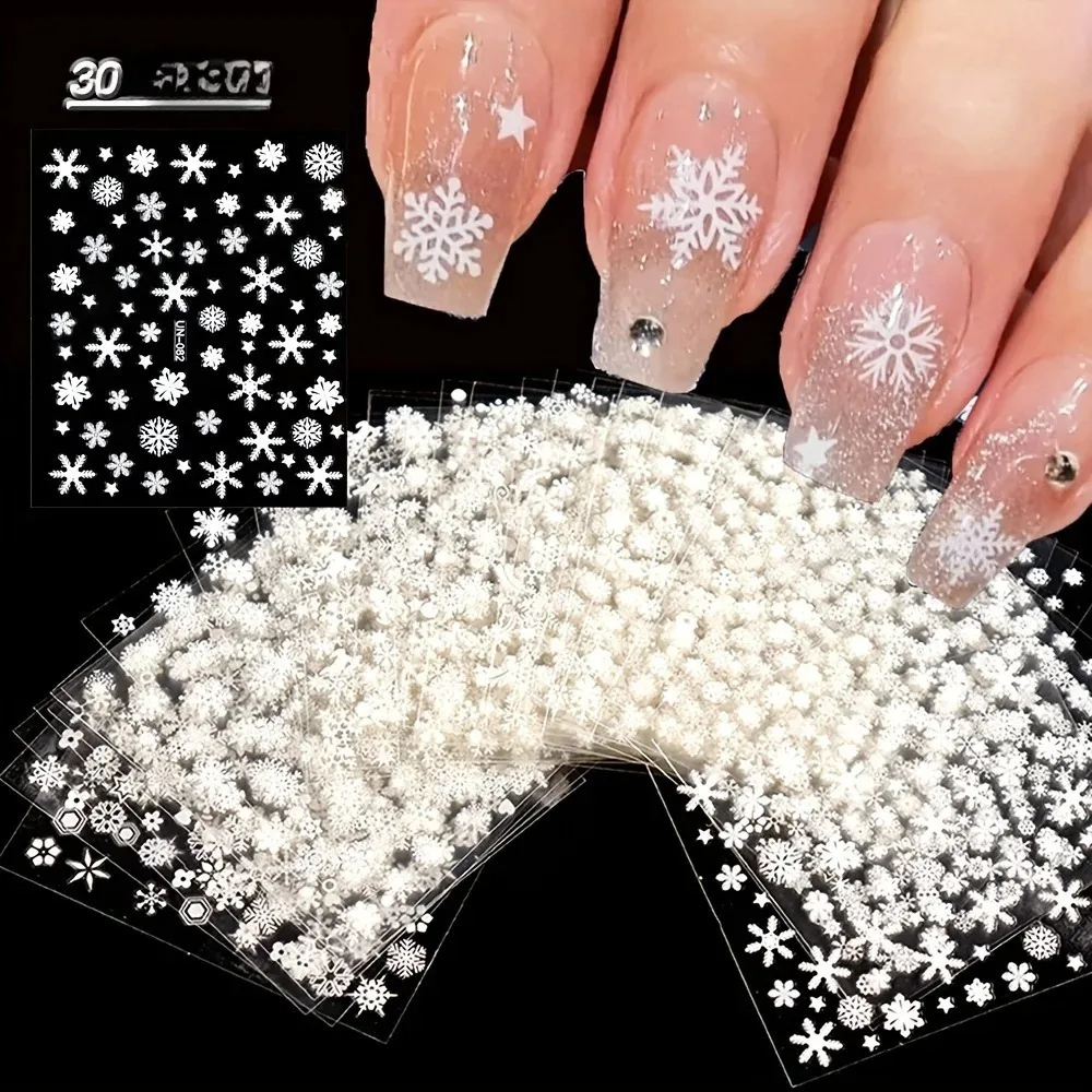 손톱 장식용 크리스마스 네일 아트 스티커 30개, 만화 눈송이와 눈사람 패턴이 있는 자가 접착식
