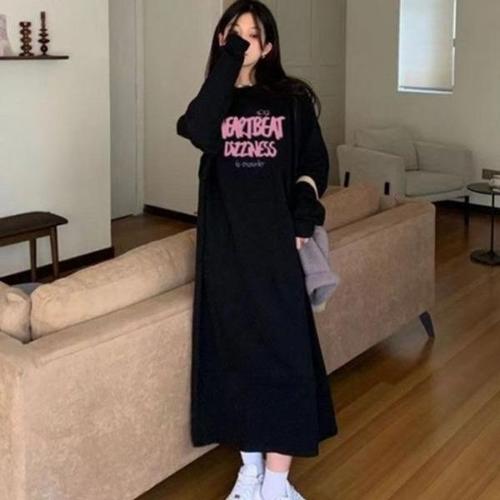 해피유통 여성 가을겨울 기본 롱슬리브 레터링 원피스 편안한 루즈핏 일자형wd