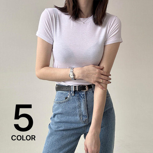여성 기본티 유넥 세미 크롭 스판 반팔티 실켓티