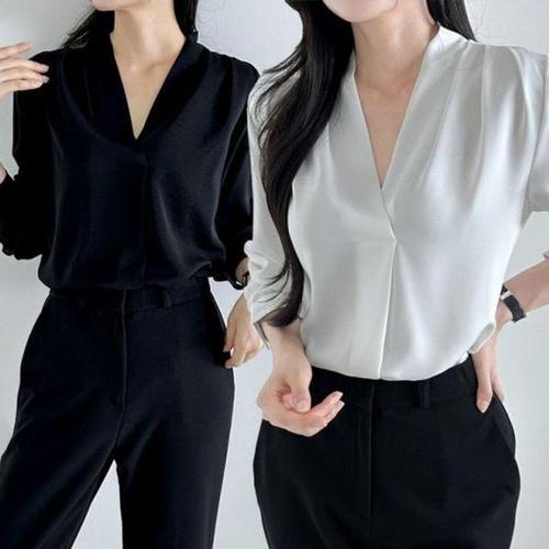 [에이치플러스몰]흰색 브이넥 블라우스 면접용 셔츠 기본 정장 긴팔