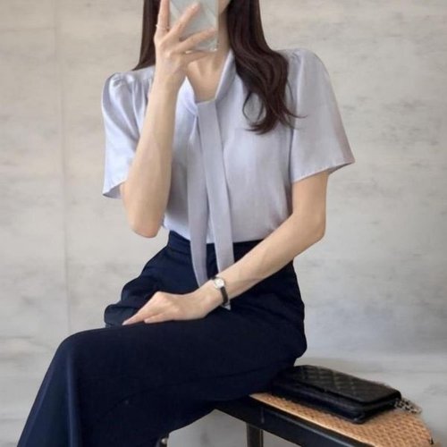 [옷자락] 여성 기본 넥라인 리본 세미 반팔 블라우스