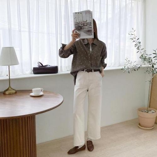 [다잇템]여성 카라넥 꽃무늬 자수 주머니 진청 셔츠