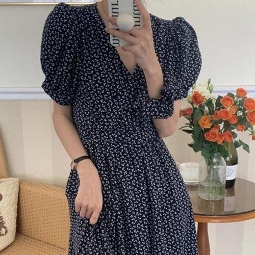 떳다그녀 코렐리아 플라워 퍼프소매 브이넥 휴양지 바캉스룩 여름 레이스 꽃 반팔 맥시 롱원피스