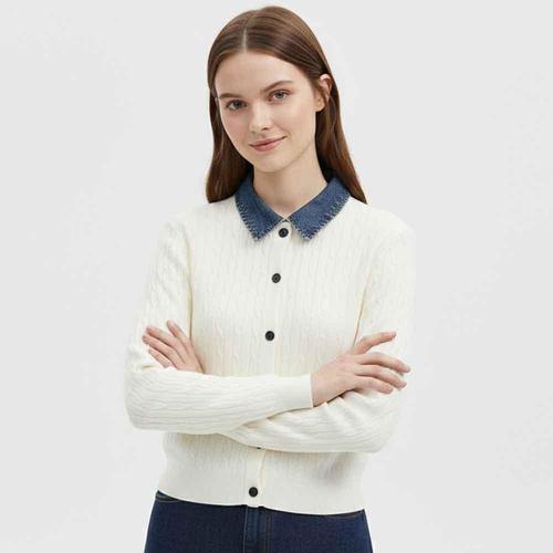 여성 데님 카라넥 꽈배기 니트 베이직 가디건 NARU-WCD-21039-아이보리