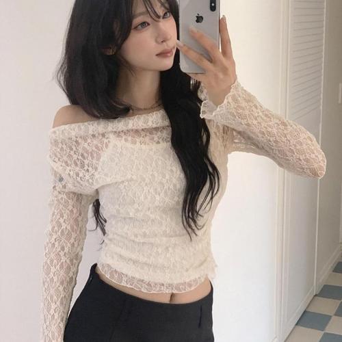 [옷자락]여자 슬림핏 레이스 셔링 오프숄더 끈나시 세트