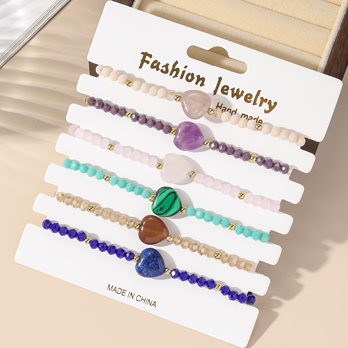 TEMU 6줄 웨스턴 스타일 순수 핸드메이드 비드 쌀 비드 하트 탄성 세트, 개별 니치 디자인 러브 패션, 유니크 피치 하트 주얼리, 여성 데일리 및 모든 행사 착용에 적합, 발렌타인데이에 그녀를 위한 완벽한 선물