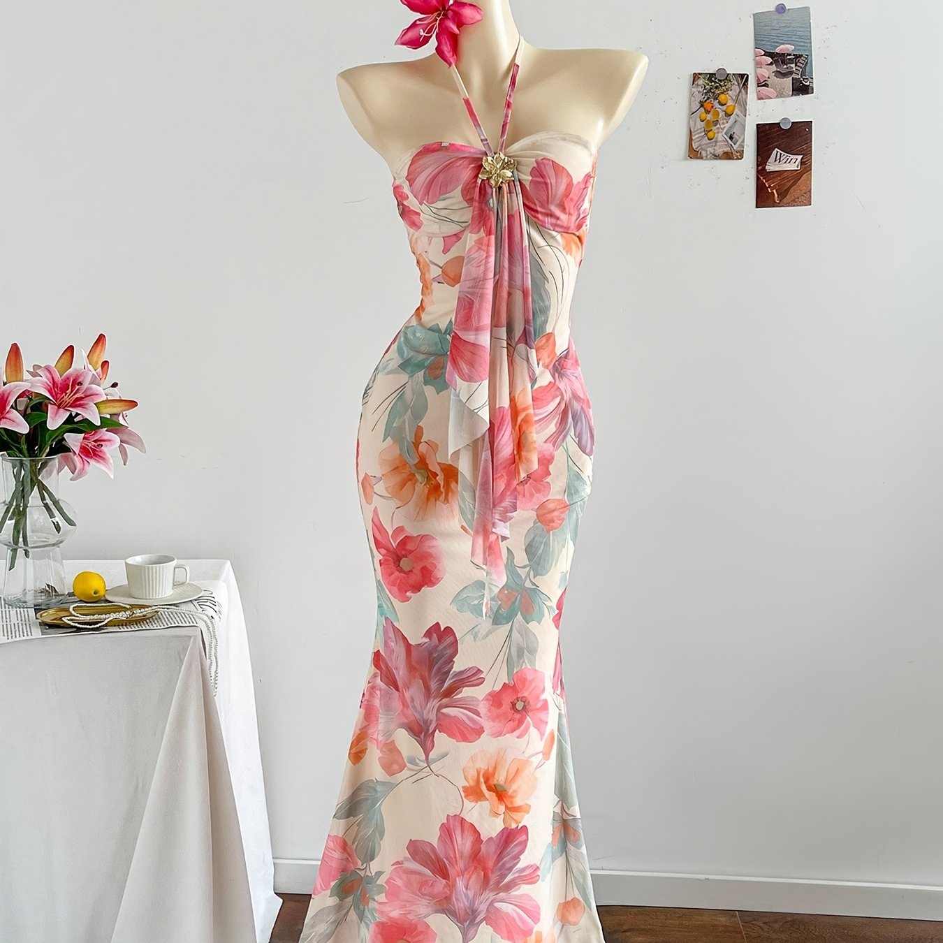 TEMU 우아한 여성 프린트 피쉬테일 드레스, 반도 칼라 및 메탈 버클 | 로맨틱 매듭 디자인, 휴가, 파티, 데이트, 티타임에 적합, 섹시하고 우아함