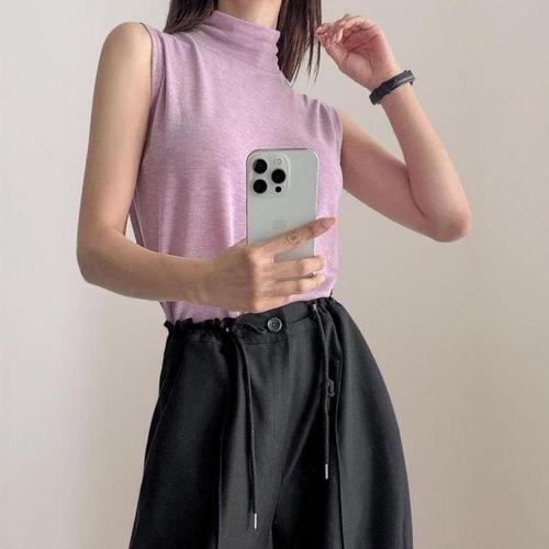 여성용 데일리 민소매 터틀넥 나시 슬림 스판 폴라 니트 티셔츠