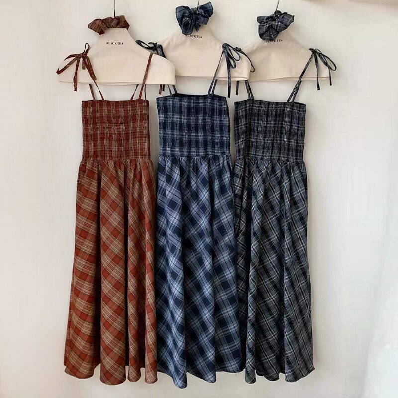 나시원피스 민소매 롱 A라인 체크 면 여성 원피스