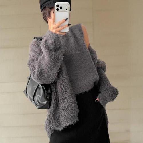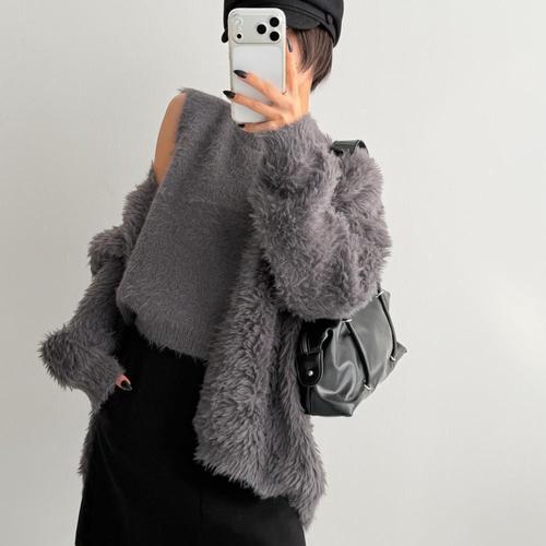 [신상오픈런]여성 시어링 루즈핏 브이넥 퍼 가디건 겨울 털 나시 세트