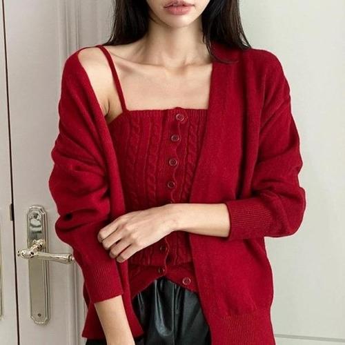 [신상오픈런]|CDD2169|여자 꽈배기 포인트 버튼 나시 울 가디건 세트_19004285_597559