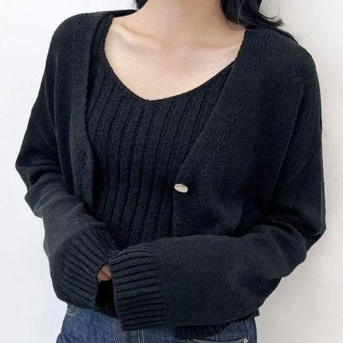[다잇템]여자 골지나시 단추 카디건 브이 홀터네크 세트