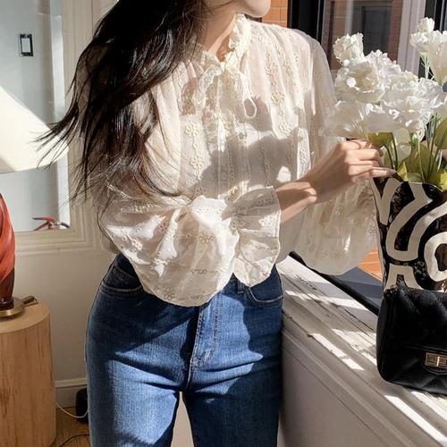 [옷자락]여성 프릴 디테일 시스루 나시 세트 봄용 블라우스