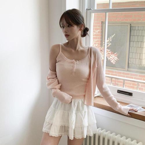 [옷자락]여성 레이스 버튼 나시 브이넥 골지 가디건 세트
