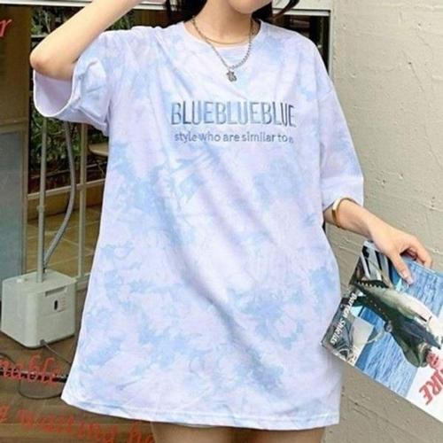 [엄지척]여성 숏 하이웨스트 나염 염색 블루 세미 크롭 반팔티_19611399_667501