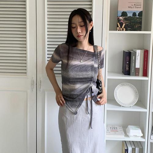 [옷자락]여자 라운드넥 물나염 언발 트임 사이드 사선 셔링 스트랩 세미크롭 반팔티