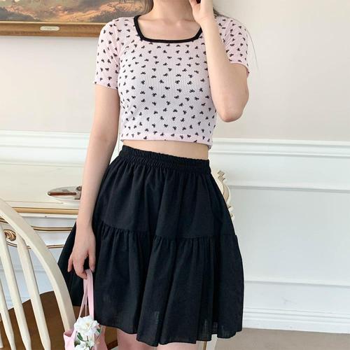 [옷자락] 여자 스퀘어넥 리본 나염 골지 반팔티